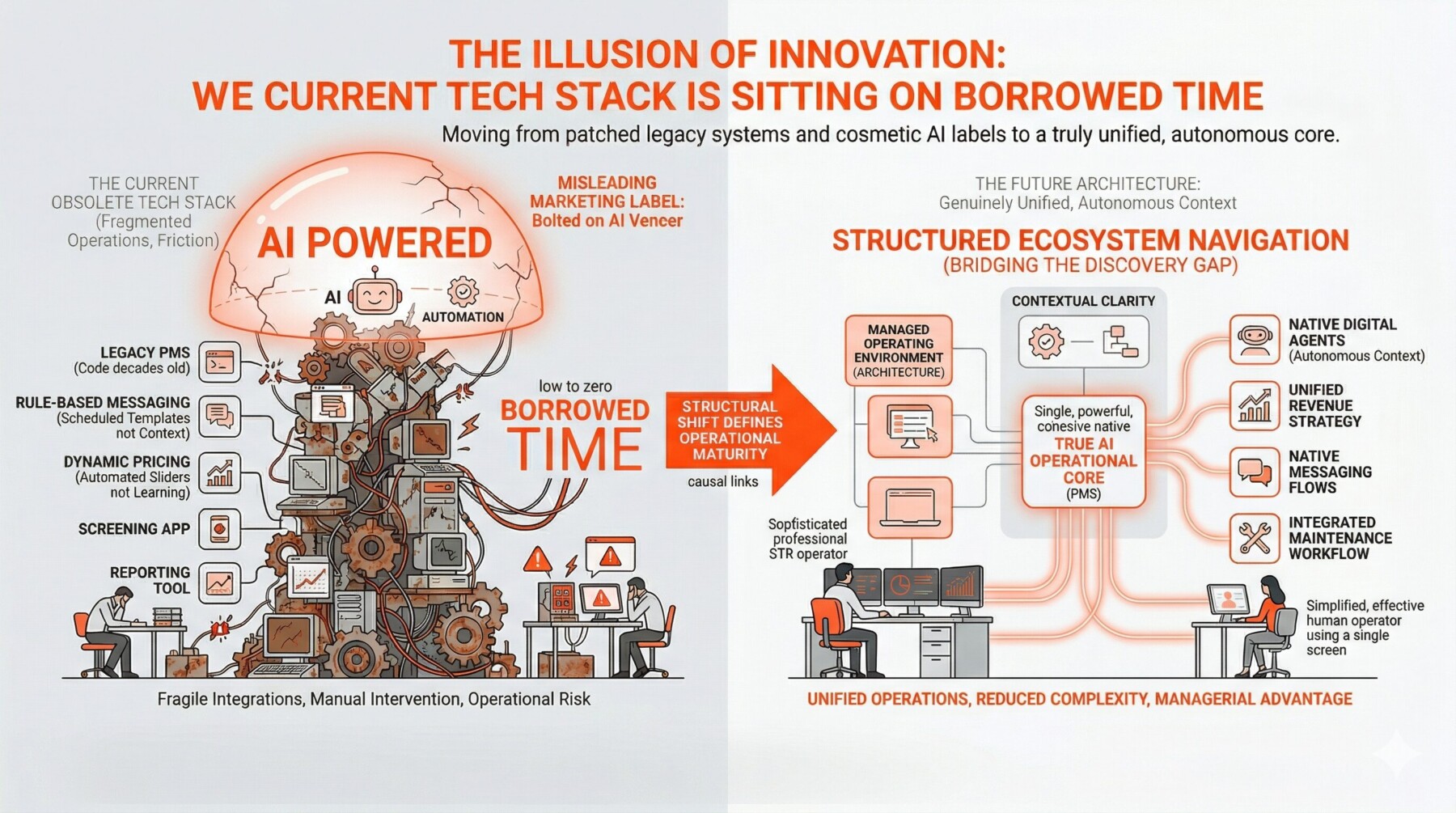 The current short term rental technology stack is rapidly approaching obsolescence. Vendors are slapping misleading artificial intelligence labels onto outdated legacy systems, creating cosmetic updates rather than real solutions. Operators must look past marketing hype and prepare for true architectural shifts that genuinely unify and simplify digital operations.