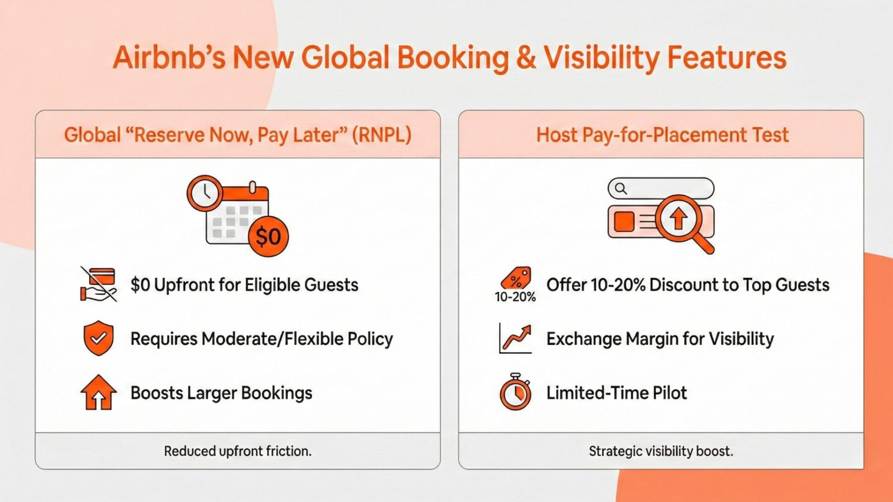 Short Description Airbnb is reshaping its 2026 booking strategy with two major updates. First, the $0-upfront 'Reserve Now, Pay Later' option is expanding globally to drive conversions, especially for premium listings, requiring hosts to adopt flexible cancellation policies. Second, a new pilot program allows hosts to offer discounts to highly rated guests in exchange for boosted search visibility. These changes give hosts new yield management tools but require careful margin analysis.
